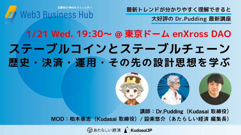 【企業向けセミナー】ステーブルコインとステーブルチェーンー歴史・決済・運用・その先の設計思想を学ぶ(1/21 19:30〜 @東京ドーム enXross DAO)